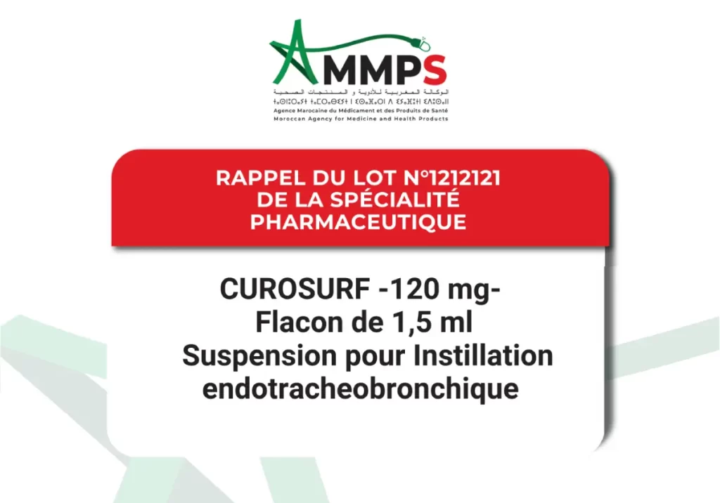 أعلنت وكالة الأدوية والمنتجات الصحية المغربية عن سحب دفعة من دواء ”CUROSURF” بتركيز 120 ملغ، المستعمل في علاج اضطرابات الجهاز التنفسي لدى حديثي الولادة، وذلك على خلفية رصد خطر محتمل للتلوث الميكروبي.